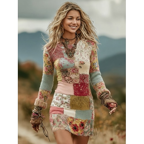 Per donna Mini Abito Vestito T-Shirt Casual Abiti semi formali Quotidiano Ufficio Vestibilità regolare Geometrico Pied-de-poule Manica Lunga Girocollo Blu Marrone scuro Rosa Rosso Primavera Autunno