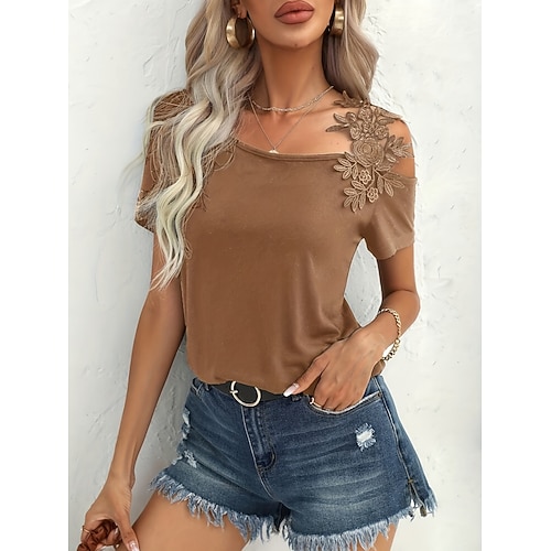 Per donna Maglietta Semplice Moda Elegante Classico Manica Corta Scollo a V Top Regolari Quotidiano Weekend Pizzo Patchwork Nero Bianco Marrone Verde Estate Primavera
