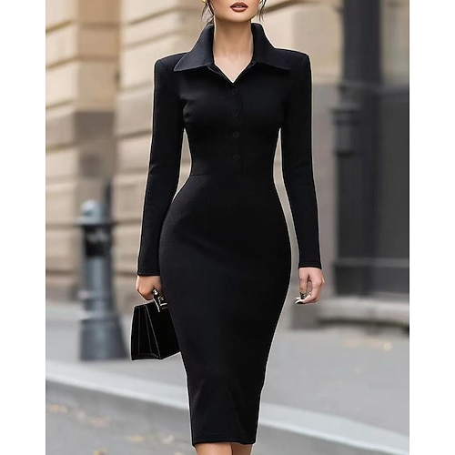 Per donna Abito Midi Abito nero Tubino Elegante Moda Moderno Quotidiano Uscire Weekend Vestibilità regolare Semplice Manica Lunga Colletto a Camicia Nero Primavera Autunno Inverno
