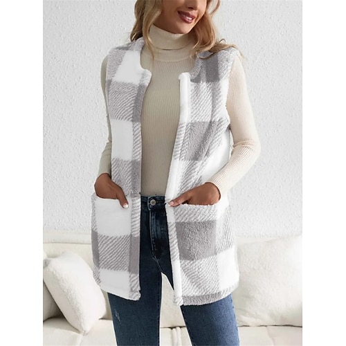 Per donna Gilet Esterno Strada Da tutti i giorni Autunno Inverno Standard Cappotto Standard Tenere al caldo Traspirante Moda Informale Giacca Senza maniche Righe e Plaid Con tasche Nero Cachi Grigio