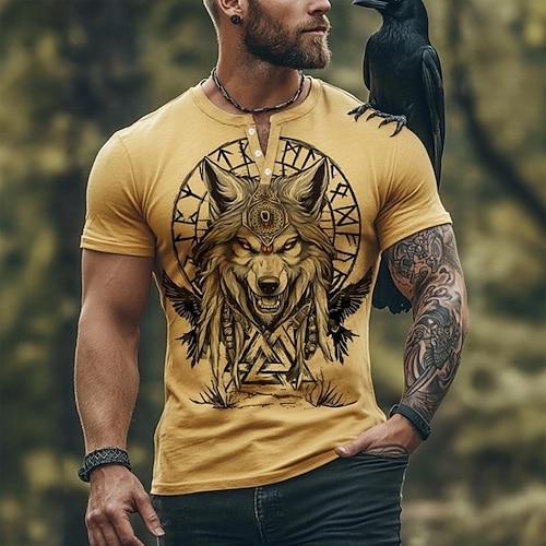 Per uomo Lupo Maglietta Maglia Henley Manica Corta Designer Retrò Vintage Casuale Quotidiano Streetwear Estate Primavera Tutte le stagioni Giallo Henley Maglietta Henley