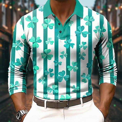 Giorno di San Patrizio Per uomo Trifoglio Polo Manica Lunga Magliette polo Bavero Casual All'aperto Abbigliamento quotidiano Abito da festa Stampa 3D Bottoni Primavera Autunno Inverno Blu Verde