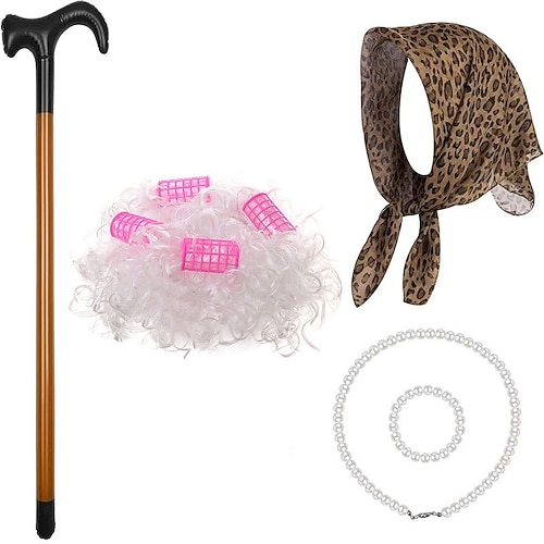 kit costume da vecchia signora con parrucca bianca rulli, foulard leopardato, set di braccialetti con collana di perle, bastone da passeggio: perfetti per 100 giorni di scuola vestirsi da nonna