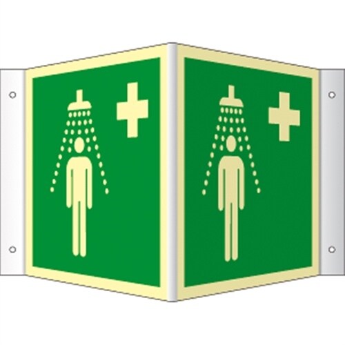Winkelschild Notdusche, ISO 7010, Kunststoff, nachleucht., 160-mcd, 200x200 mm