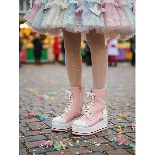 Stivali wedge rosa antico per donne con motivo ondulato – scarpe con lacci in stile dolce Lolita per cosplay di anime e parate di Carnevale