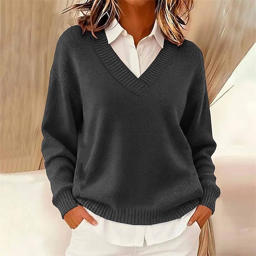 Per donna Maglione Elegante Tinta unica A Coste Scollo a V Pizzo Manica Lunga Top Regolari Maglia Quotidiano Nero Bianco Primavera Autunno