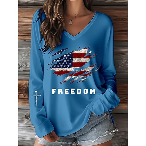 Giorno dell'Indipendenza Americana Per donna Maglietta Grafico Lettera Vintage Elegante Classico Manica Lunga Scollo a V Top Regolari Quotidiano Stampato Blu Nero Bianco Rosso Estate Primavera