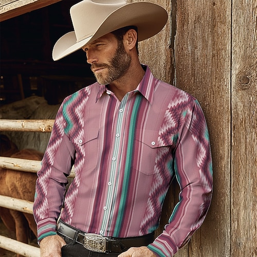 Per uomo Griglia / Plaid Motivo Geometrico Etnico Camicia Camicia Western Camicia da cowboy Manica Lunga Vintage Retrò All'aperto Casuale Abbigliamento da lavoro Primavera Autunno Collo ripiegato Due