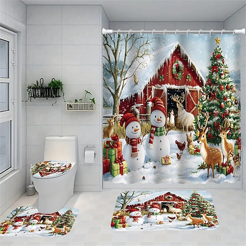 tenda da doccia in quattro pezzi, con sedile WC antiscivolo e robusto e tappetino da bagno – motivo a fiocco di neve con albero di Natale e pupazzo di neve, materiale in poliestere impermeabile con 12