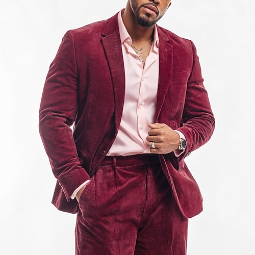 Uomo Affari Casuale Abito in velluto a coste Bavero classico Nero Borgogna Affari Casual Tinta unita Vestibilità su misura 2 pezzi Monopetto a un bottone
