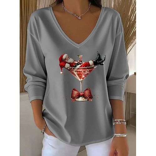 Natale Per donna Maglietta Grafico Babbo Natale Natale Vintage Elegante Classico Manica Lunga Scollo a V Top Regolari Quotidiano Stampato Nero Bianco Rosso Verde Grigio Primavera Autunno Inverno