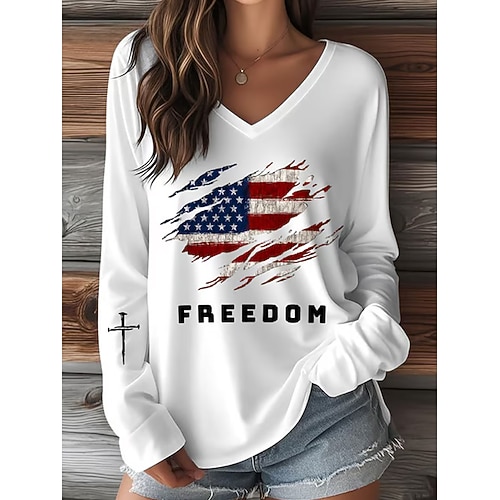 Giorno dell'Indipendenza Americana Per donna Maglietta Grafico Lettera Vintage Elegante Classico Manica Lunga Scollo a V Top Regolari Quotidiano Stampato Blu Nero Bianco Rosso Estate Primavera