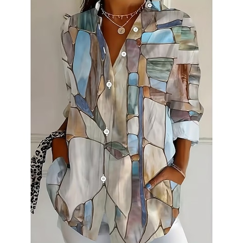 Per donna Camicia Blusa Grafico Astratto Vintage Elegante Casual Manica Lunga Scollo a V Colletto a Camicia Top lunghi Quotidiano Patchwork Bottoni Stampato Blu Giallo Arancione Estate Primavera