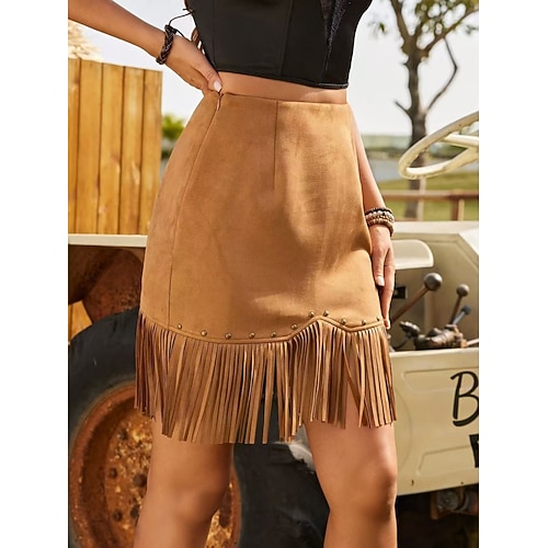 Per donna Gonna Linea A Vintage Casual Boho Mini Vita Alta Gonne Semplice Frangia con nappe Micro-elastico Streetwear Quotidiano Marrone Primavera Pelle scamosciata