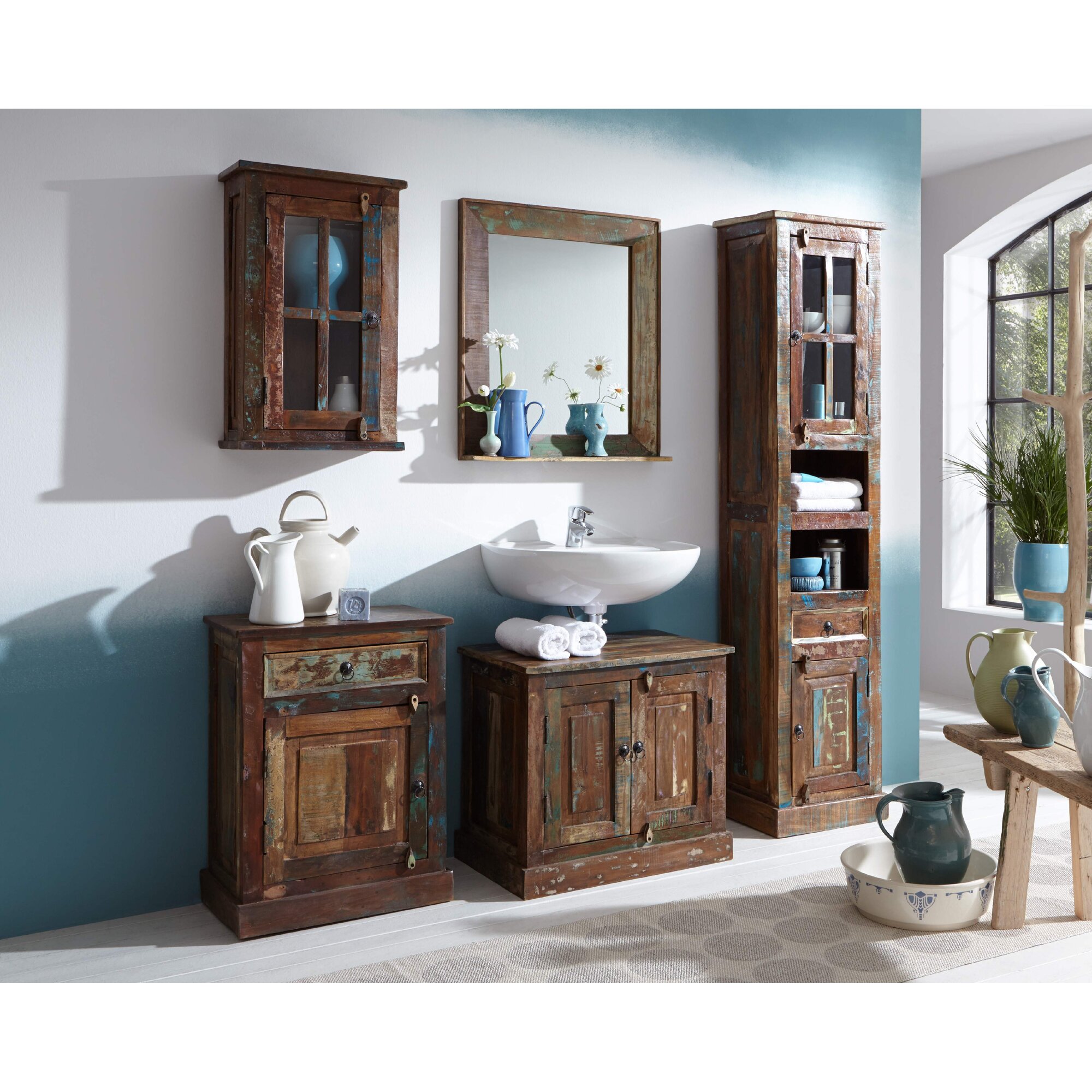 Badmöbel-Set HOME AFFAIRE "WESTMINSTER, Bad im Landhausstil, 2-teiliges Badezimmer", weiß (pinie weiß dekor), B:150cm H:200cm T:46cm, Kastenmöbel-Sets, Badmöbel-Set, Waschtisch, Spiegel, Midischrank, Regal, in 2 Farben, Breite 150 cm