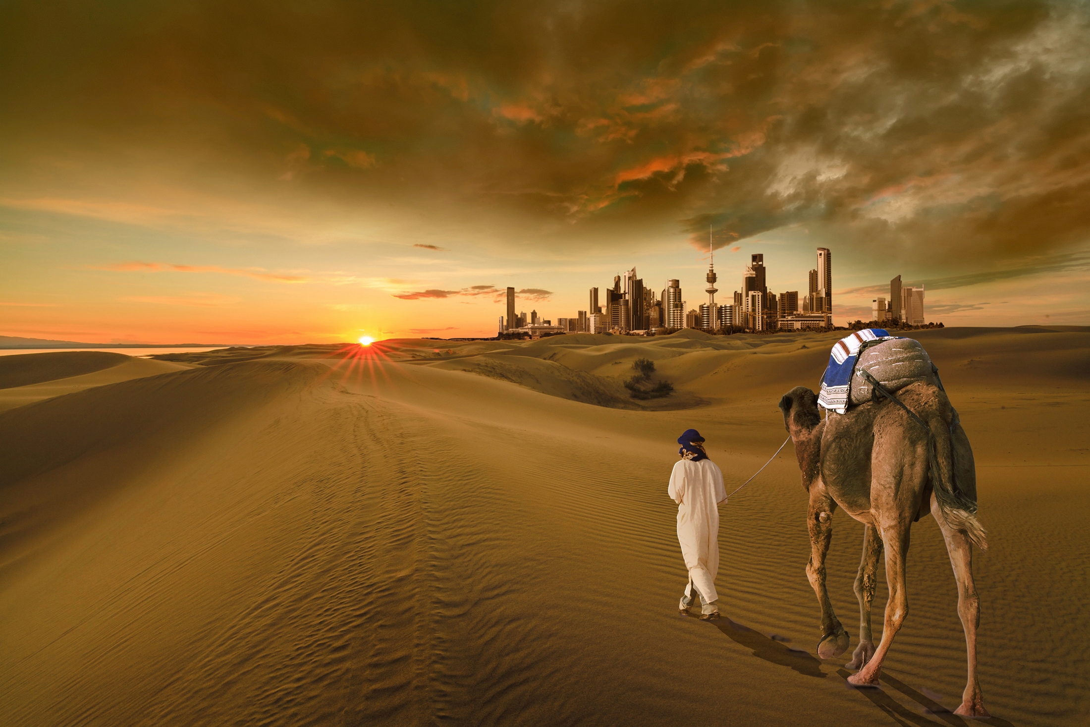 Fototapete PAPERMOON "KUWAIT-STADT-WÜSTE KAMEL DÜNEN SKYLINE STRAND MEER GOLF", bunt, B:4,50m L:2,80m, Vlies, Tapeten