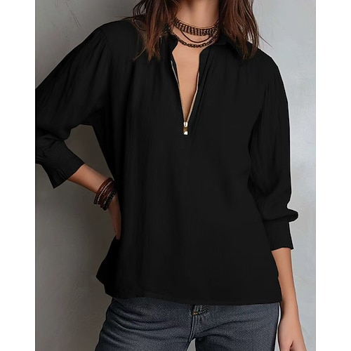 Per donna Camicia Blusa Semplice Vintage Elegante Manica Lunga Colletto a Camicia Top Regolari Quotidiano Ferie Uscire Cerniera Blu Nero Rosso Verde Albicocca Estate Primavera