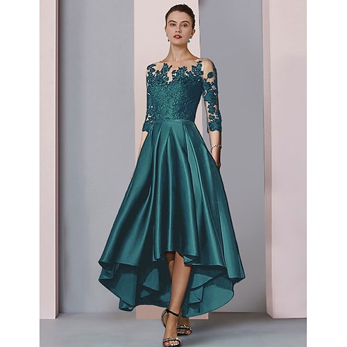 Abito A-Line per la madre della sposa Abito da invitata elegante Scollo a barco asimmetrico lunghezza tè in satin pizzo maniche 3/4 con pieghe applicazioni