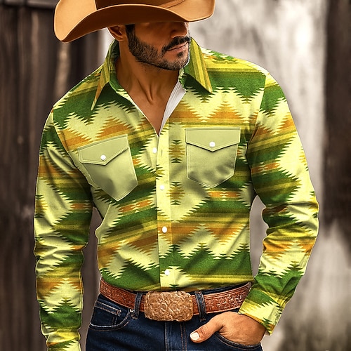 Per uomo Motivo Geometrico Etnico Camicia Camicia Western Camicia da cowboy Manica Lunga Vintage Retrò All'aperto Casuale Abbigliamento da lavoro Primavera Autunno Collo ripiegato Due tasche