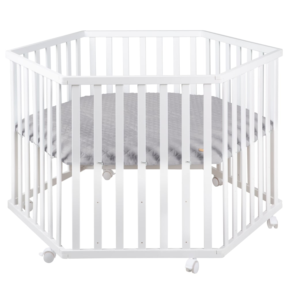 Box esagonale con ruote regolabile con tappeto grigio in legno bianco