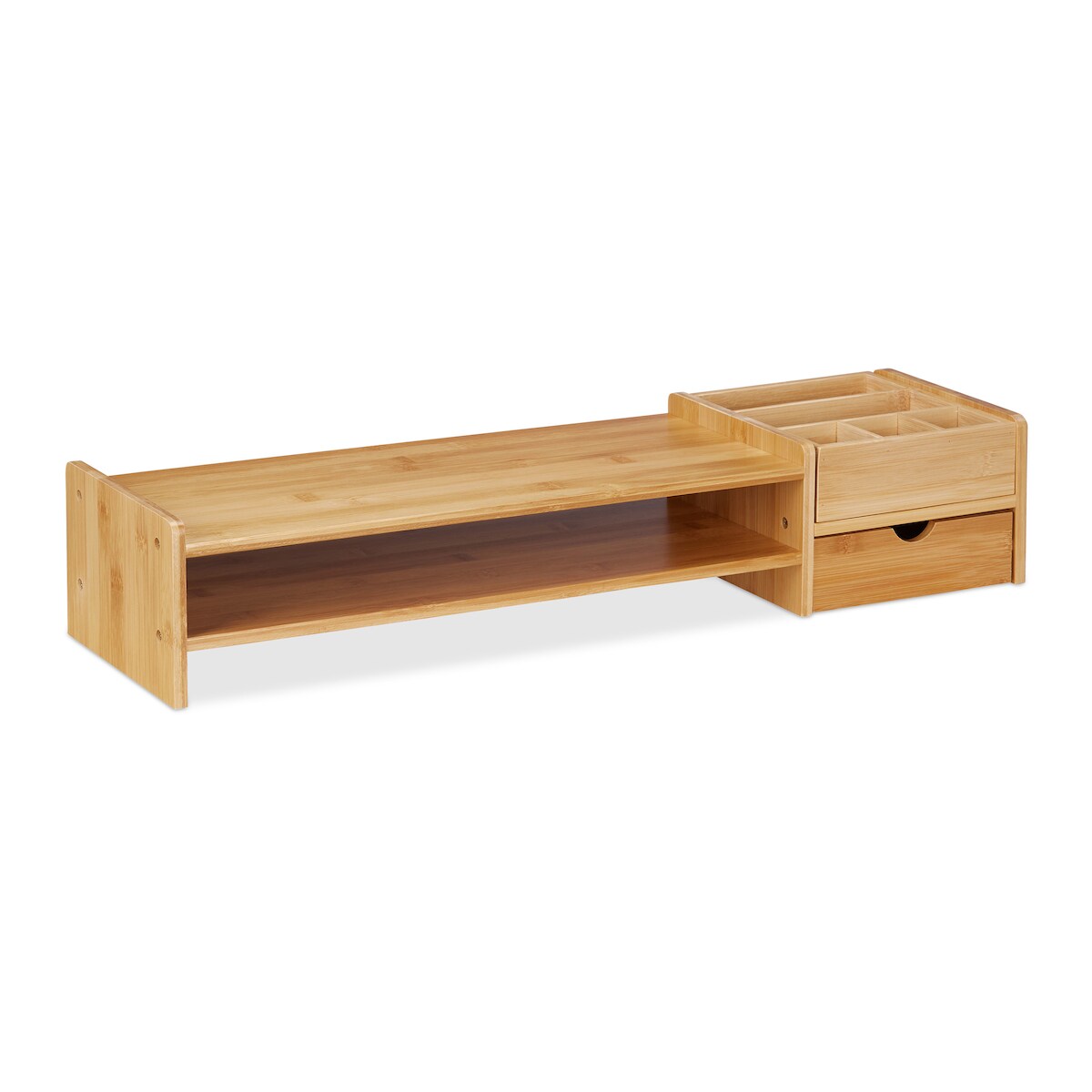 Relaxdays Monitorständer Bambus, Bildschirmerhöhung für Schreibtisch, HBT: 13 x 70 x 19 cm, Schublade & 7 Fächer, natur