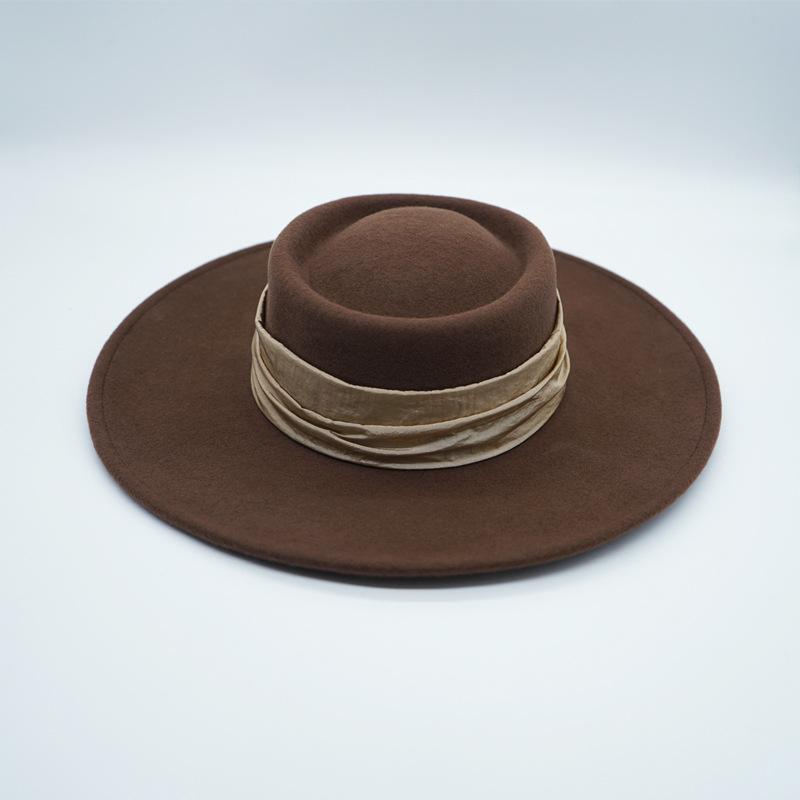Brown Big Brim Wide Brim French Retro Woolen Panama Flat Top Top Hat Women'S Autumn And Winter British Felt Street Hat 56-58cm