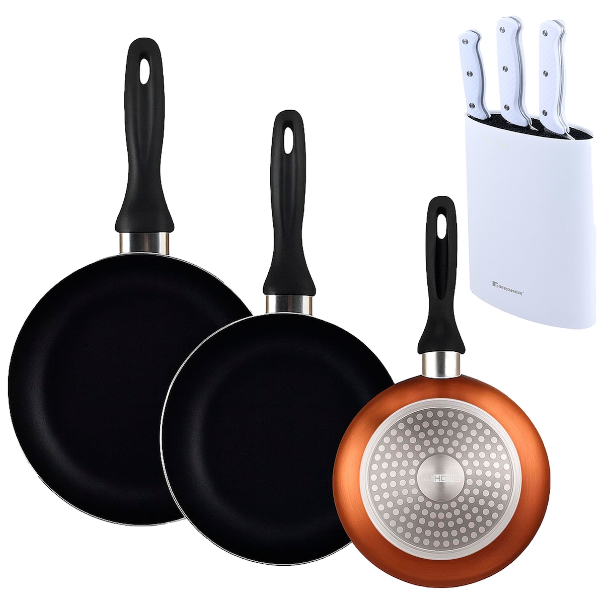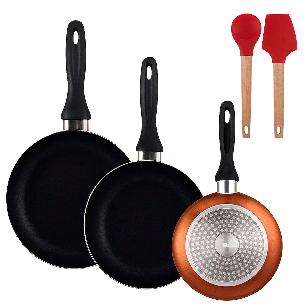 BERGNER - Set aus 3 Pfannen Ø16/20/24cm aus gepresstem Aluminium in metallic-bronze mit 2-teiliges Küchenutensilien-Set EXCALIBUR