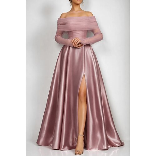 Linea ad A Lunghezza al pavimento Abito da Sera Da principessa Abito formale Elegante Vintage Scintillante Manica Lunga Senza Spalle Matrimonio Formale Tasca Raso con Pieghe Arricciato Spacco