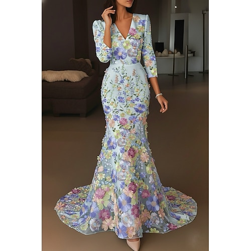 Linea ad A Lunghezza al pavimento Abito da Sera Elegante Floreale Madre della sposa Manica 3/4 Scollo a V Festa in giardino Matrimonio Raso Pizzo con Pieghe