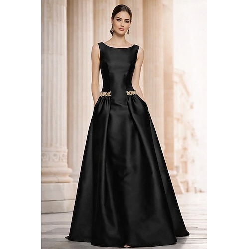 Linea ad A Lunghezza al pavimento Abito da Sera Elegante Brillanti Senza Maniche Scollo a Barca Matrimonio Formale Raso con Arricciato Cristalli