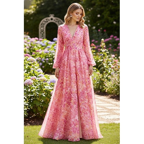 Linea ad A Lunghezza al pavimento Abito formale Elegante Senza Maniche Scollo a V Festa in giardino Matrimonio Tasca Organza con Pieghe Spacco Stampa