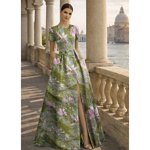 Linea ad A Lunghezza al pavimento Abito da Sera Da principessa Elegante Vintage Floreale Manica Corta Girocollo Festa in giardino Matrimonio Tasca Jacquard Shiena scoperta con Spacco Tasca