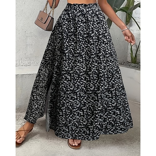 Per donna Gonna Moda Casual Maxi Vita Alta Gonne Floreale Stampato Con Spacco Micro-elastico Quotidiano Vacanza Nero Rosso Blu reale Azzurro cielo Estate Poliestere