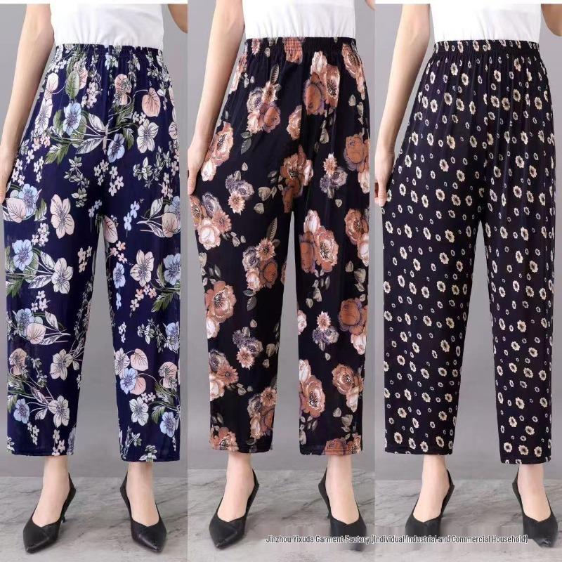 Casual Summer Women's Plus Size Ice Silk Stretch Pants - Loose, High Elastic Waist for Middle-Aged and Elderly cm