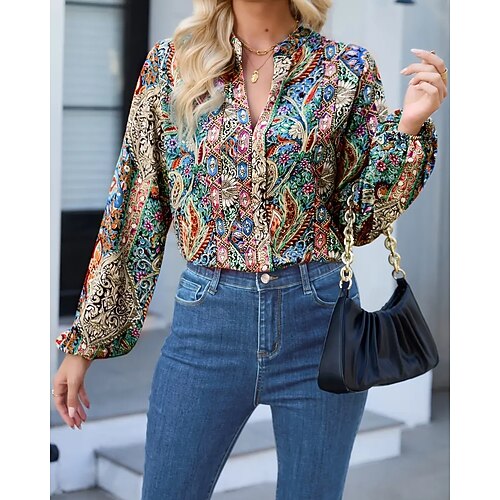 Per donna Camicia Blusa Floreale Vintage Elegante Moderno Manica Lunga Scollo a V Colletto a Camicia Top Regolari Quotidiano Ferie Uscire Bottoni Stampato Blu Estate Primavera