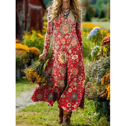 Per donna Abito Midi Abito a trapezio Vacanza Casual Quotidiano Vestibilità regolare Grafico Geometrico Manica Lunga Girocollo Blu Rosso Arancione Estate Primavera Autunno