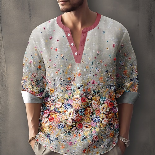 Per uomo Floreale Camicia Camicia con Bottoni Maglia Henley Manica Lunga Vintage Casual Quotidiano Ferie Estate Primavera Autunno Senza colletto Scollo a V Stampato Grigio