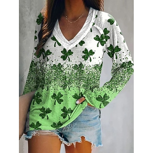 T-Shirt da donna di San Patrizio con grafica Piante Elegante Stilosa Classica Maniche Lunghe Collo a V Top Regolari Stampa Quotidiana Uscita Weekend Bianca Verde Scuro Verde Estate Primavera Autunno