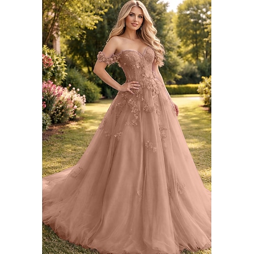 Linea ad A Strascico a Terra Abiti da Ballo Elegante Senza Maniche Scollo a Cuore Formale Tulle con Pieghe Paillettes Applicazioni