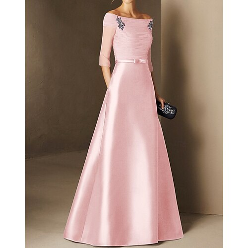 Abito A-Line da Sera Abito Elegante Abito Formale Ospite di Matrimonio Lunghezza A Terra Maniche Lunghe Collo Tondo Satin Stretch con Glitter