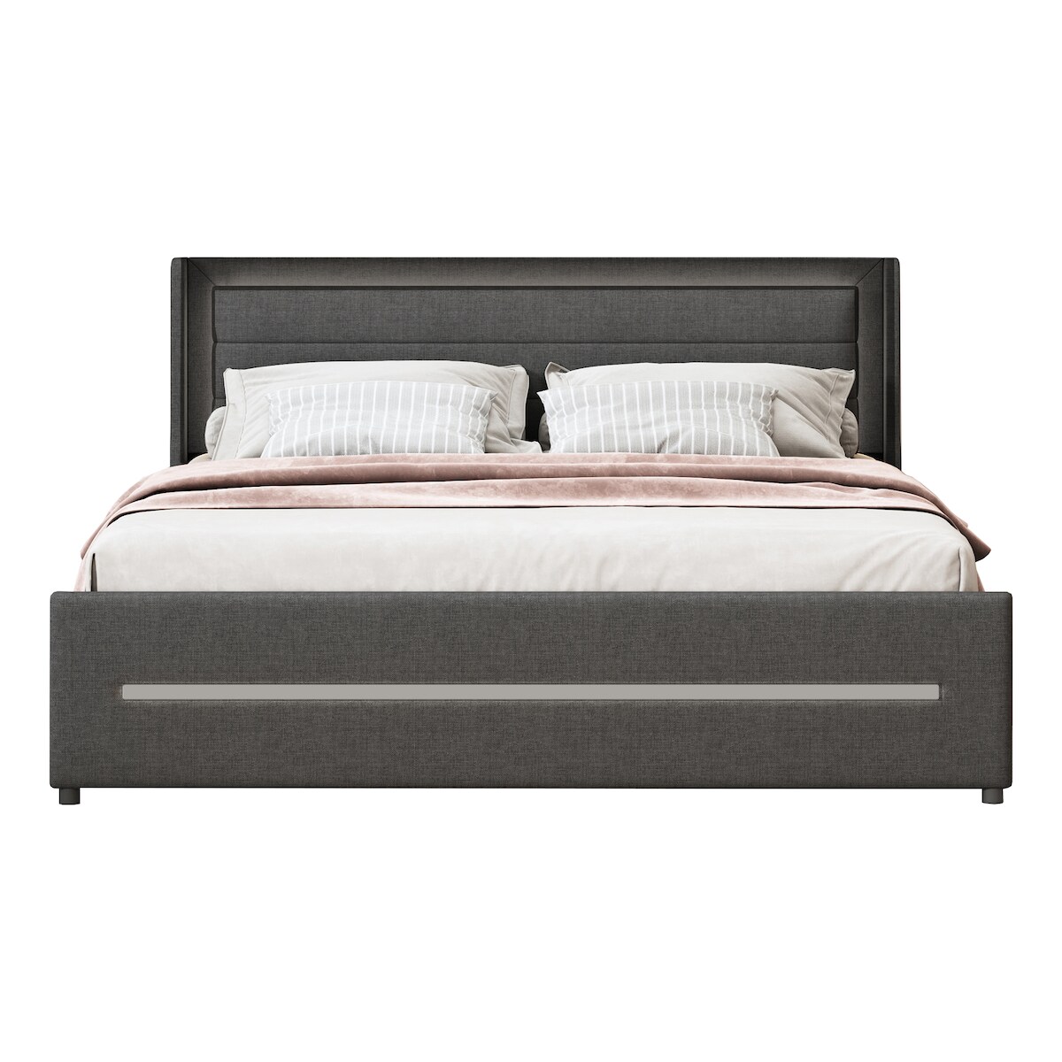 OKWISH Polsterbett 160x200 cm Grau mit LED-Beleuchtung, Schubladen, Leinenstoff, Lattenrost, modernes Doppelbett, 4 Stauraum, komfortables Schlafzimmer