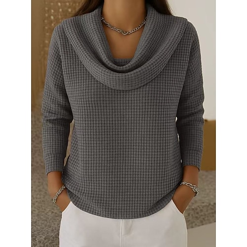 Maglietta da donna a griglia con motivo waffle, stile tropicale, vintage, manica lunga, collo a cappuccio, top regolari, nero, giallo, blu, verde, grigio, primavera, autunno, inverno