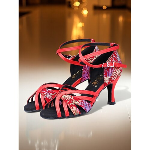 Scarpe da ballo latino da donna con cinturino, tacchi in raso con motivo a piume arcobaleno, cinturino incrociato sicuro alla caviglia, suola flessibile per allenamento e performance calzature da