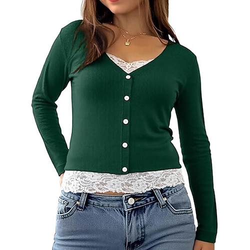 Per donna Blusa Tinta unica Elegante Casual Manica Lunga Scollo a V Top Regolari Quotidiano Pizzo Patchwork Bottoni Nero Rosa Rosso Marrone Verde Primavera Autunno Inverno