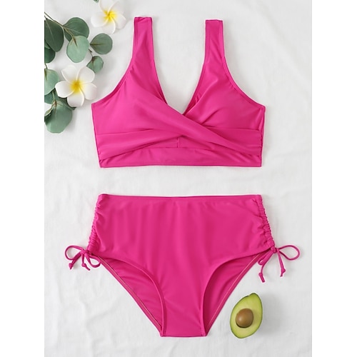 Costume da bagno bikini da donna in 2 pezzi con arricciature schiena scoperta estate in spiaggia colore solido scollo a V senza maniche