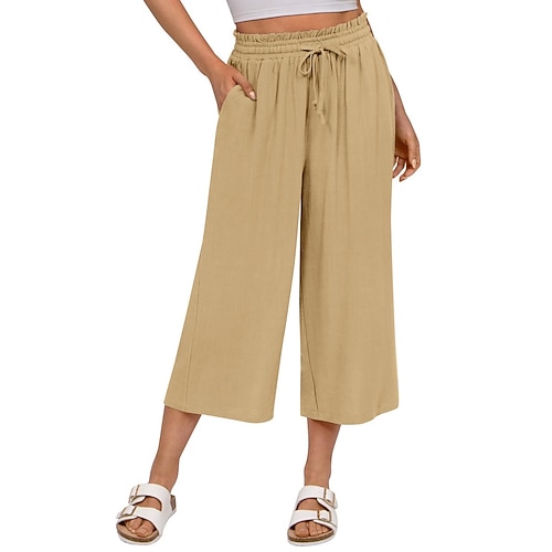 Pantaloni larghi da donna in cotone e lino in tinta unita chinos pantaloni larghi base casual a lunghezza intera vita alta lisci con elastico comfort all'aperto micro-elastico vacanza strada
