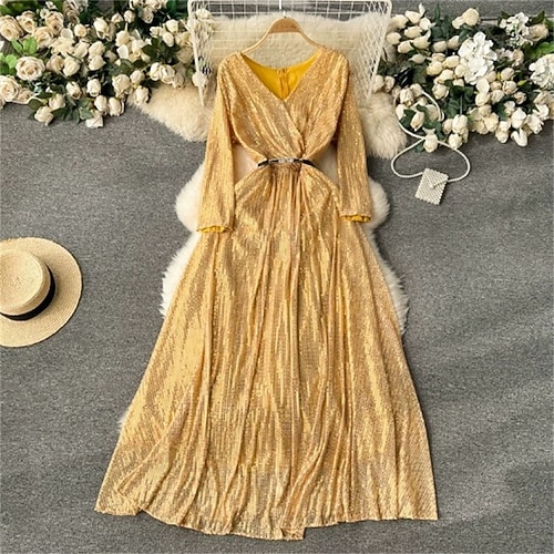 Per donna Abito Midi Abito con Paillettes Elegante Moda Moderno Quotidiano All'aperto Spiaggia Vestibilità regolare Semplice Manica Lunga Scollo a V Blu Nero Bianco Giallo Primavera Autunno