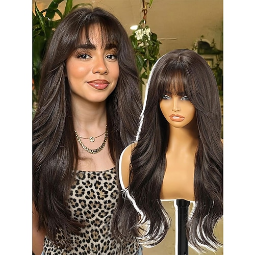 Parrucca castana con mèches bionde e frangia, parrucca castana a strati per donna, parrucche lunghe e ondulate, parrucca sintetica per feste, uso quotidiano, 26 pollici