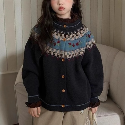 Bambini Ragazze Cardigan maglione Grafico All'aperto Manica Lunga Cardigan con Bottoni Vintage 4-12 Anni Autunno Nero