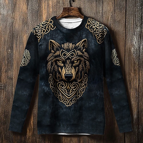 Per uomo Maglia Blu Nero Marrone Girocollo Lupo Nodo celtico Stampato Casuale Quotidiano Abbigliamento casual alla moda Vintage Vichingo Autunno Inverno Abbigliamento Felpe con cappuccio Felpe Manica